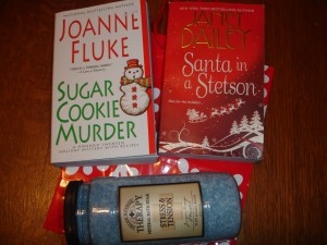 Finally we wrapped up our night with our gift exchange.  We each bring a gift averaging around $10 and we wrap it up.  We roll dice and if you get a seven or doubles you get to choose a gift.  Once everyone has chosen a gift, we go one more round with the dice and if you get a seven or doubles you can trade your package with someone else that may look more tempting.  Then we all open them and show off what we got.  I got two good looking reads, Santa is a Stetson and Sugar Cookie Murder along with some bath soak.  Love it!