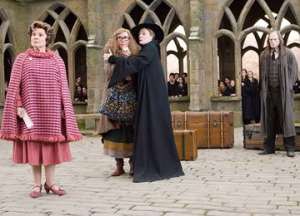 Then there is the new addition to the school compliments of the Ministry of Magic, Dolores Umbridge.  A short toad like of a woman who is scrutinizing everything going on in Hogwarts much like a child would do to an ant with a magnifying glass.  In no time at all she has Harry off the Quidich team … banned for life (there’s that dirty word banned again!) and in desperation the Griffindor Team puts Ron in as Keeper.