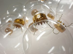 An assortment of glass ornaments like pictured above. The craft stores have some fun shapes – squares, tear drop, egg-shaped, heart-shaped, coin shaped, etc…. mix it up – it is fun