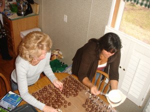 finishing touches... Cindy putting on chocolate, Heidi drizzling the white