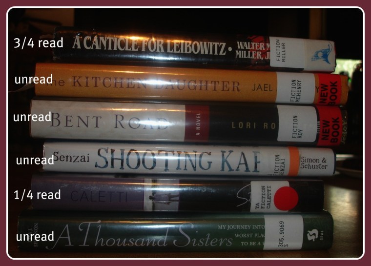 Yesterday afternoon I sadly had to return many (MANY) library books unread.  *sigh*.  I had renewed them on-line twice and then finally it came down to who was I kidding… as much as I wanted to read them… it wasn’t going to happen in the time frame I needed to read them, and really…. has it come to this?  Book hording?  Really Sheila?  Holding books for my own selfish reasons making it impossible for others to read them…