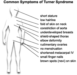 Occurring in 1 in 2000[3] – 1 in 5000 phenotypic females,[4] the syndrome manifests itself in a number of ways. There are characteristic physical abnormalities, such as short stature, swelling, broad chest, low hairline, low-set ears, and webbed necks.[5] Girls with Turner syndrome typically experience gonadal dysfunction (non-working ovaries), which results in amenorrhea (absence of menstrual cycle) and sterility. Concurrent health concerns are also frequently present, including congenital heart disease, hypothyroidism (reduced hormone secretion by the thyroid), diabetes, vision problems, hearing concerns, and many autoimmune diseases.[6] Finally, a specific pattern of cognitive deficits is often observed, with particular difficulties in visuospatial, mathematical, and memory areas.[7]