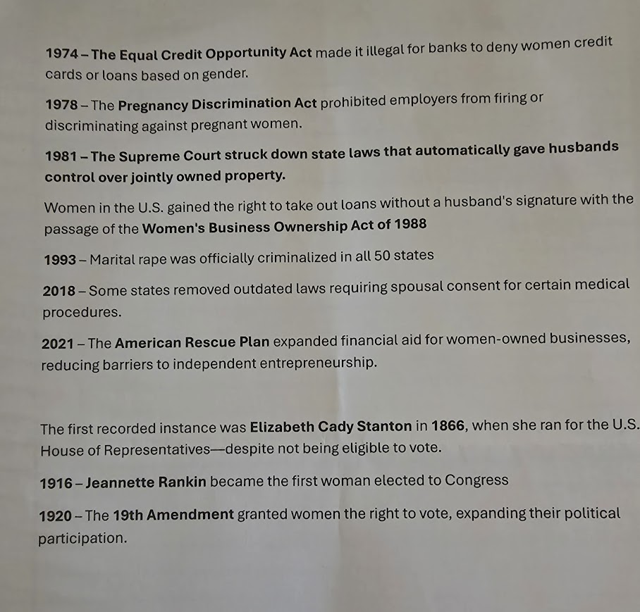 Women’s rights ( we had a list of when laws were passed – see below), actually frightening to see how much of this has happened in our lifetime.